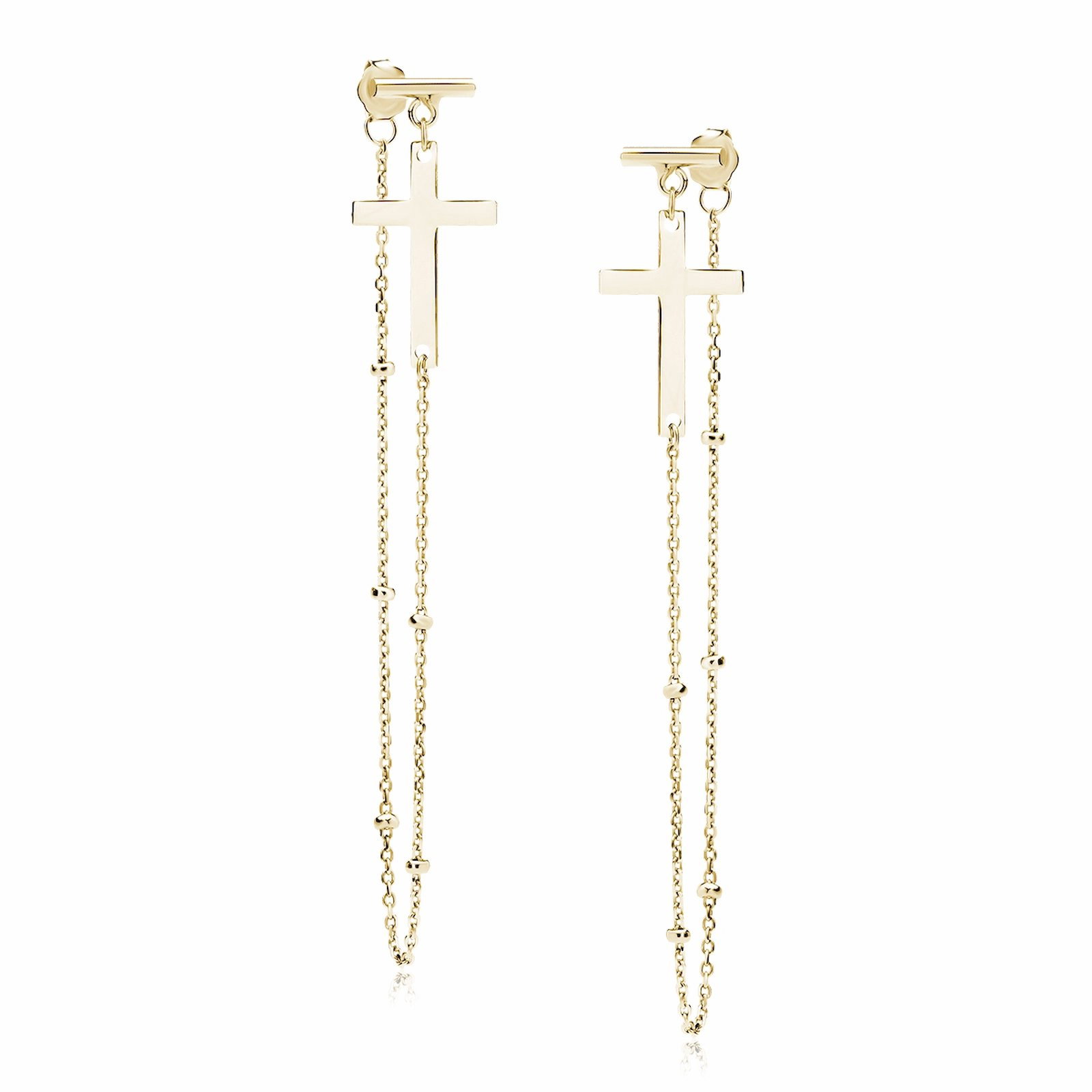 Designul se remarca prin lantisorul fin decorat cu bilute delicate, care sustine un pandantiv cruciulita de 17 x 11 mm. Cu o lungime totala de 67 mm, acesti cercei ofera o miscare fluida si un aspect sofisticat, fiind perfecti pentru stilul fashion contemporan.