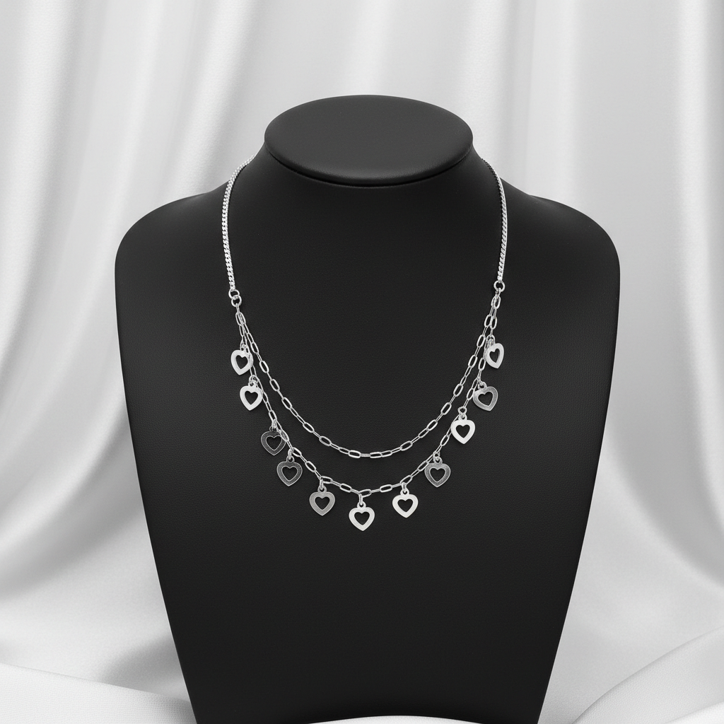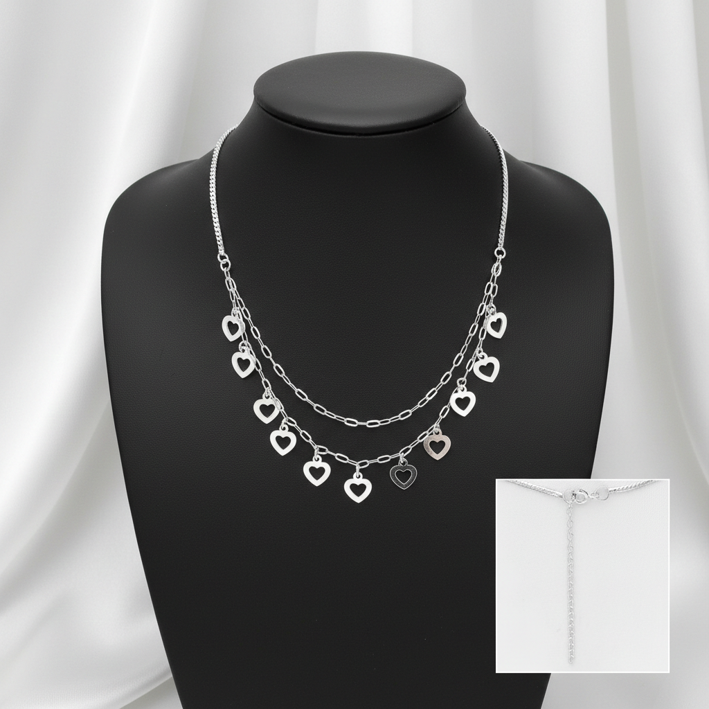 Bijuteria se remarca prin designul sau dublu, avand pandantive delicate in forma de inima cu dimensiuni de 11 x 7 mm. Colierul are o greutate de 6.3 gr si este lucrat Fara placaj, pastrand stralucirea naturala a argintului de inalta calitate.